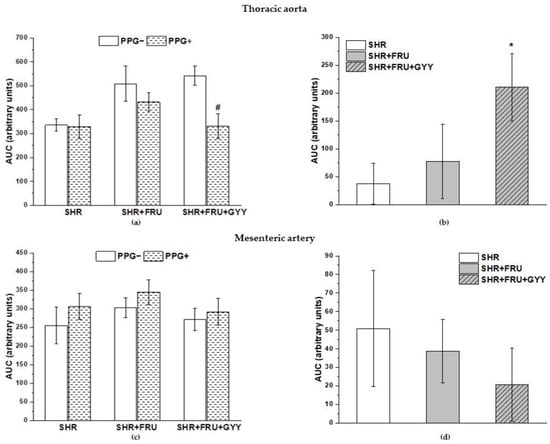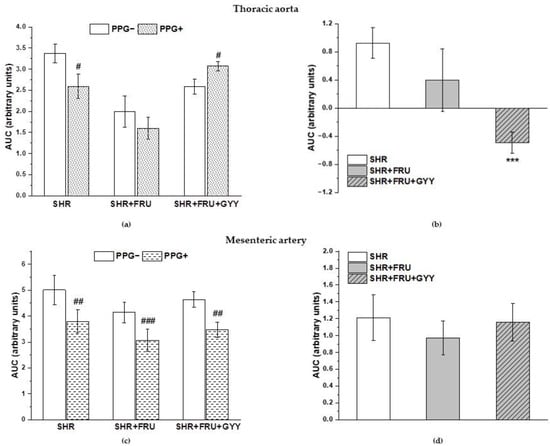 The participation of the H2S/CSE system in the relaxant responses of thoracic aorta (a,b) and mesenteric artery (c,d). The AUC calculated before and after the pre-treatment with PPG in individual groups (a,c). The difference between the AUC before and after PPG—comparison among groups (b,d). Arteries were isolated from spontaneously hypertensive rats (SHRs), SHRs treated with fructose (SHR+FRU), and SHRs treated with fructose and GYY-4137 (SHR+FRU+GYY). AUC—area under the curve; PPG—DL-propargylglycine. The data are presented as the mean ± S.E.M. Statistical analysis was performed by paired t-test or one-way ANOVA. * p < 0.05 vs. SHR, # p < 0.05 vs. PPG—within the relevant group.