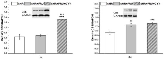 The expression of H2S-producing enzymes CSE (a) and CBS (b) in the left ventricle. Tissue was isolated from spontaneously hypertensive rats (SHRs), SHRs treated with fructose (SHR+FRU), and SHRs treated with fructose and GYY-4137 (SHR+FRU+GYY). CSE—cystathionine γ-lyase; CBS—cystathionine β-synthase. Data are expressed as the mean ± S.E.M. Statistical analysis was performed by one-way ANOVA. ** p < 0.01 and *** p < 0.001 vs. SHR, +++ p < 0.001 vs. SHR+FRU.