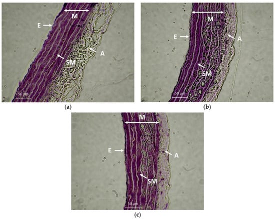 The wall of the thoracic aorta isolated from spontaneously hypertensive rats (SHR) (a), SHRs treated with fructose (SHR+FRU) (b) and SHRs treated with fructose and GYY-4137 (SHR+FRU+GYY) (c). The 5 µm thick cryosections were stained with methylen blue and displayed using optical microscope (40× magnification). E—layer of endothelial cells, SM—layer of smooth muscles, A—adventitia, M—media.