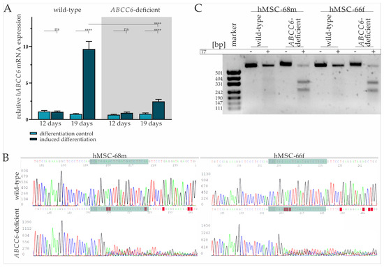 The tracing of the ABCC6 gene expression in ABCC6-deficient hMSCs revealed no change between the differentiation-inducing and differentiation control cultivation after day 12, but a 3.23-fold (±0.67) increase in differentiated hMSCs at day 19 (Figure 1A). Compared to wild-type hMSCs, the ABCC6 gene expression was diminished by 73.4% (±4.1%) in ABCC6-deficient hMSCs at day 19 of differentiation.