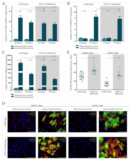 The PLIN1 mRNA expression was highly induced when culturing wild-type (day 12: 4086-fold ± 825.74; day 19: 9300.68-fold ± 1655.20) and ABCC6-deficient hMSCs (day 12: 5404.17-fold ± 1629.74: day 19: 4269.14-fold ± 904.77) in induction medium at both time points. Significant differences between induced wild-type and ABCC6-deficient hMSCs were not observed at day 12 but were at day 19, as PLIN1 gene expression was reduced in ABCC6-deficient hMSCs by 37% (±6%) (Figure 2C).