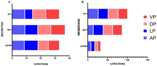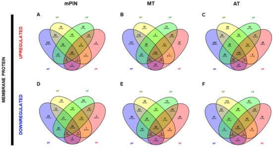 Analysis of membrane protein targets showed upregulated genes: in the AP lobe (mPIN = 403 genes; MT = 510 genes; AT = 536 genes), DP lobe (mPIN = 263 genes; MT = 319 genes; AT = 377 genes), LP lobe (mPIN = 261 genes; MT = 369 genes; AT = 421 genes), and VP lobe (mPIN = 127 genes; MT = 316 genes; AT = 303 genes). The downregulated genes for membrane proteins were as follows: in the AP lobe (mPIN = 184 genes; MT = 237 genes; AT = 192 genes), DP lobe (mPIN = 146 genes; MT = 204 genes; AT = 347 genes), LP lobe (mPIN = 245 genes; MT = 264 genes; AT = 308 genes), and VP lobe (mPIN = 88 genes; MT = 207 genes; AT = 181 genes) (Figure 1A).