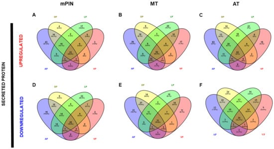 A list of secreted protein genes common to all four prostate lobes was also performed. The number of genes commonly upregulated for secreted proteins was as follows: in mPIN = 33 genes, MT = 52 genes, and AT = 63 genes (Figure 3A–C). The number of downregulated common genes for secreted proteins present in the four lobes was as follows: in mPIN = 25 genes, MT = 31 genes, and AT = 26 genes (Figure 3D–F).