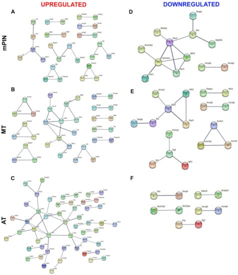 The PPI network involves common genes analysis of a cluster of membrane proteins of GEMM Pb-Cre4/Ptenf/f PCa. PPI of commonly upregulated genes in mPIN (A), MT (B), and AT (C), and downregulated genes in mPIN (D), MT (E), and AT (F). Analysis using STRING [] illustrates potential interactions. Proteins in the interaction network are represented as nodes connected by lines whose thickness reflects a confidence index higher than 0.7. mPIN = mouse Prostatic Intraepithelial Neoplasia; MT = Middle-stage tumor; AT = Advanced-stage tumor.