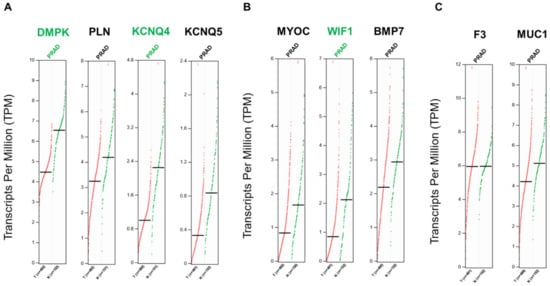 Differential gene expressions of transcripts translated into the membrane and secreted proteins in prostate cancer. (A)—Genes from downregulated membrane proteins. (B)—Genes from downregulated secreted proteins. (C)—Genes from upregulated proteins are commonly present in secreted and membrane proteins. Differential expression levels were calculated using the web based GEPIA tool []. GEPIA analysis revealed that genes of the proteins identified were negatively regulated in PRAD. Genes were considered positively or negatively regulated written in red and green, respectively, in PRAD (n = 489–492) relative to normal tissue (n = 150–152) when absolute values of fold-change were >1.0 and the q-value < 0.01 (ANOVA). Red dots: indicate prostate cancer tumor samples; green dots: indicate normal prostate samples.