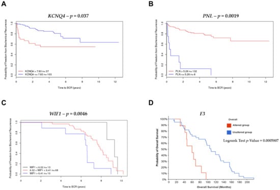 Kaplan–Meier curves displaying the probability of freedom from BRC and overall survival of PCa with (red) or without (blue) Differentially Expressed Genes (DEGs) overexpression. Analyzed by the Cambridge Carcinoma of the Prostate App (CamcAPP) (https://bioinformatics.cruk.cam.ac.uk/apps/camcAPP/) [] (accessed on 21 December 2021) and the cBioPortal for Cancer Genomics database (https://www.cbioportal.org/) (accessed on 21 December 2021) [,] from an integrative study. (A)—Kaplan–Meier curve with the probability of freedom from biochemical recurrence of PCa with (red) or without (blue) KCNQ4 overexpression with cut-off = 7.83 from the MSKCC study []; the difference was statistically significant, p = 0.037. (B)—Kaplan–Meier curve with the probability of freedom from biochemical recurrence of PCa with (red) or without (blue) PLN overexpression with cut-off = 5.28 from the MSKCC study []; the difference was statistically significant, p = 0.0019. (C)—Kaplan–Meier curve with the probability of freedom from biochemical recurrence of PCa with WIF1 expression with cut-off <6.02 (black line), WIF1 gene expression with cut-off <6.41 (red line), and patients with WIF1 gene expression with cut-off >6.41 (blue line) (p = 0.0046) from the Stockholm study []; the difference was statistically significant, p = 0.0046. (D)—Kaplan–Meier curve with the probability of overall survival of PCa patients with (red) or without (blue) F3 alteration from the metastatic prostate adenocarcinoma (MCTP, Nature 2012) study []; the difference was statistically significant, p = 0.0005807.