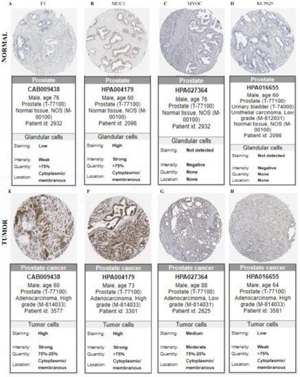 The validation of target genes in normal and tumor tissues. Immunostaining of normal and prostate tumor samples, respectively, for targets in our samples are: F3 (A,E); MUC1 (B,F); MYOC (C,G); and KCNQ5 (D,H), using immunohistochemical data available in the Human Protein Atlas database (https://proteinatlas.org/ accessed on 21 December 2021).