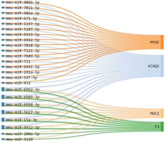 We used the miRWalk 3.0 tool (http://mirwalk.umm.uni-heidelberg.de/) [] to perform the regulatory interaction between miRNA and mRNA (MYOC, KCNQ5, MUC1, and F3); the algorithm for target validation was used in other available databases of Homo sapiens. The miRNA was considered significant when involved with at least three of the four genes selected. An alluvial plot diagram was generated using the online tool SankeyMATIC (http://sankeymatic.com/) to demonstrate the interaction networks between the miRNA and mRNA.