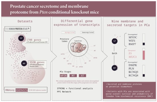 An overview of the main methodological strategies and results of prostate cancer secretome and membrane proteome from Pten conditional knockout mice and human prostate cancer. Here, we combined the selection of transcripts from the list of protein-coding genes of the secretome and membrane proteome dataset using The Human Protein Atlas Secretome and the Pten conditional knockout mice dataset (GSE 94574). After finding the upregulated and downregulated genes in the mPIN, MT and AT stages of PCa, we performed the GO enrichment analysis, PPI network using the STRING database, and the gene expression levels of the targets using the online GEPIA tool. Finally, we obtained nine (DMPK, PLN, KCNQ5, KCNQ4, MYOC, WIF1, BMP7, F3, and MUC1) deregulated PMPs and PSPs potential biomarker targets in PCa.