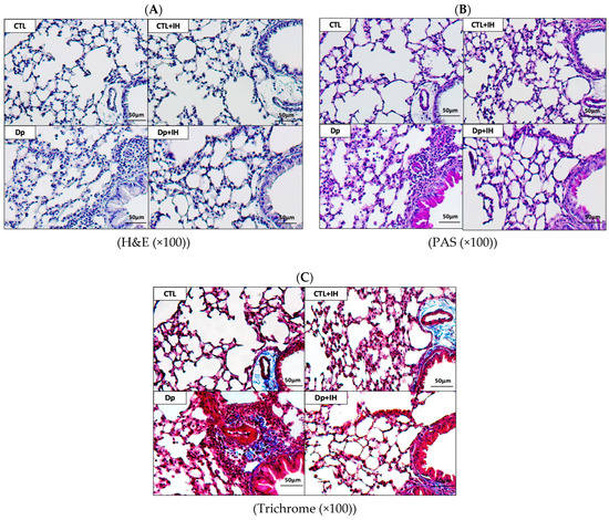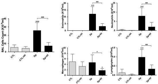 Compared to the CTL group, the Dp group showed a significant increase in the number of inflammatory cells in the bronchoalveolar lavage fluid (BALF). In contrast, the number of inflammatory cells in the BALF was significantly reduced in the Dp+IH group. In particular, the number of eosinophils, neutrophils, macrophage, and lymphocytes decreased significantly in the Dp+IH group compared to that in the Dp group (Figure 2).