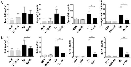 An enzyme-linked immunosorbent assay revealed that IgE, Dp-specific IgE, IgG1, and IgG2a were significantly increased in the serum of mice in the Dp group, but IgG2a was reduced in the Dp+IH group by exposure to IH (p < 0.05) (Figure 3A).