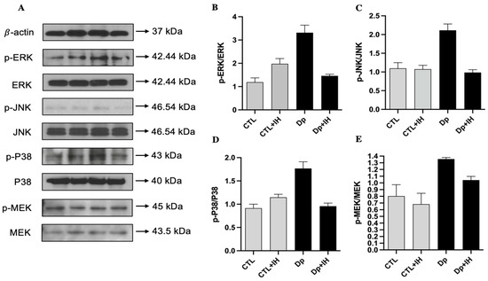 In the Dp group, we saw a significant decrease in all groups after 3 days of IH. The expression of p-JNK/JNK and p-p38/p38 significantly decreased in the Dp group after IH exposure from 211 ± 16% and 176 ± 14% to 98 ± 7% (p < 0.0001) and 95 ± 6% (p < 0.0001), respectively (Figure 4C,D). The p-ERK/ERK expression showed more of a decrease in the Dp+IH group than in the Dp group from 331 ± 32% to 146 ± 6%, (p < 0.0001), while p-MEK/MEK was slightly decreased from approximately 135 ± 2% to 104 ± 5% (p = 0.05), which is still higher than the CTL and CTL+IH groups (80 ± 17% and 68 ± 16%) (Figure 4B,E).