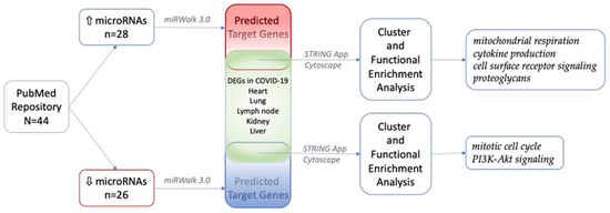 Like other RNA virus infections, the relationship between host microRNAs and SARS-CoV-2 is biunivocal. On the one hand, host microRNAs might directly inhibit viral replication, block cellular receptors, and obstruct the functioning of viral proteins, thus hindering the development of the disease [14,15,16,17]. On the other hand, infection with SARS-CoV-2 induces extensive changes in the host miRnome [18,19]. Many bioinformatic studies have used target prediction algorithms to identify the host microRNA interacting with the SARS-CoV-2 genome (Supplementary File S1). Most of the published experimental studies have investigated the expression of tissue or circulant human microRNAs upon SARS-CoV-2 infection to validate novel diagnostic or prognostic COVID-19 biomarkers and elucidate various aspects of COVID-19 physiopathology. Nevertheless, little is known about the collective impact of the predicted and experimentally validated SARS-CoV-2 interacting host microRNAs on the multiorgan transcriptomic profiles in COVID-19 disease.