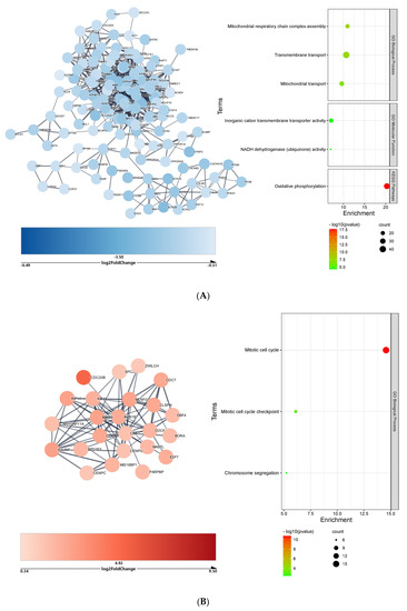 The heart downregulated DEGs targeted by upregulated microRNAs formed a complex network with 1438 nodes and 4194 edges; Markov clustering analysis identified a large cluster with 134 nodes and 708 edges (protein–protein interaction enrichment, PPI = 1 × 10−16), the functional enrichment analysis of which (Figure 2A) highlighted a significant impact on multiple biological processes, molecular functions, and KEGG pathways. The most important terms in this cluster were the Gene Ontology (GO) biological process mitochondrial respiratory chain complex assembly (22 genes) and the Kyoto Encyclopedia of Genes and Genomes (KEGG) pathway oxidative phosphorylation (37 genes). The heart upregulated DEGs targeted by downregulated microRNAs formed a complex network with 1127 nodes and 1248 edges; Markov clustering analysis identified a large cluster with 24 nodes and 88 edges (PPI = 1 × 10−16), the functional enrichment analysis of which (Figure 2B) retrieved the GO biological process mitotic cell cycle (19 genes).