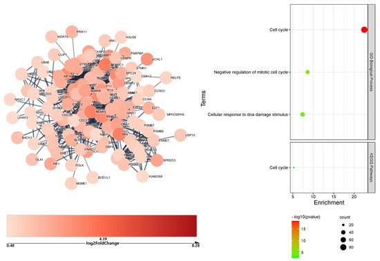 The 362 downregulated DEGs targeted by upregulated microRNAs in the lungs formed a network with 362 nodes and just 107 edges, which was unsuitable for enrichment analysis. The upregulated DEGs targeted by downregulated microRNAs formed a complex network of 584 nodes and 1993 edges. After Markov clustering, the enrichment analysis of the largest cluster (127 genes, 1348 edges, PPI = 1 × 10−16) identified the cell cycle (84 genes) as the biological process and KEGG pathway most significantly impacted by microRNAs (Figure 3).