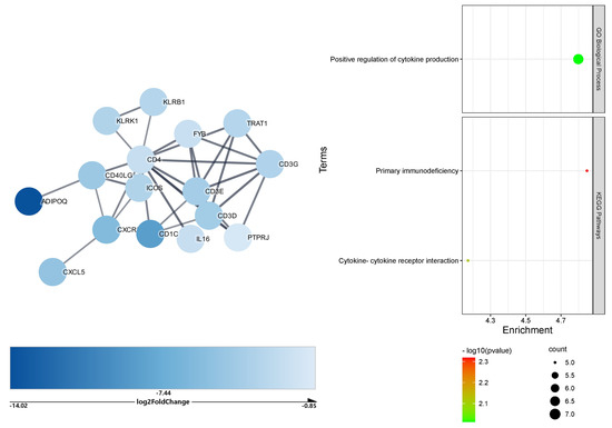 In the lymph nodes, the 369 downregulated DEGs impacted by the upregulated microRNAs formed a network of 369 nodes and 180 edges. After Markov clustering, the largest cluster identified comprised 16 genes with 33 edges (PPI = 3.6 × 10−6) (Figure 4), the functional enrichment analysis of which depicted positive regulation of cytokine production (biological process) and primary immunodeficiency (KEGG pathway) as the most impacted by microRNA. The lymph nodes upregulated DEGs potentially targeted by the downregulated microRNAs formed a network with 322 nodes and only 51 edges, which was unsuitable for functional enrichment analysis.