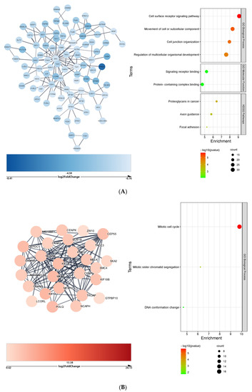 In the kidneys, the downregulated DEGs impacted by the upregulated microRNAs formed a network with 717 genes and 421 nodes. After Markov clustering, the largest cluster contained 87 nodes and 153 edges (PPI = 1 × 10−16); its enrichment analysis identified the cell-surface receptor signaling pathway (33 genes) and KEGG pathway proteoglycans in cancer (14 genes) as most significantly impacted by microRNAs (Figure 5A). The upregulated DEGs targeted by downregulated microRNAs formed a complex network of 923 nodes with 1728 edges. The results of Markov analysis showed that the largest cluster contained 27 nodes with 130 edges (PPI = 1 × 10−16), and enrichment analysis identified the mitotic cell cycle (16 genes) as the most significantly impacted biological process (Figure 5B).