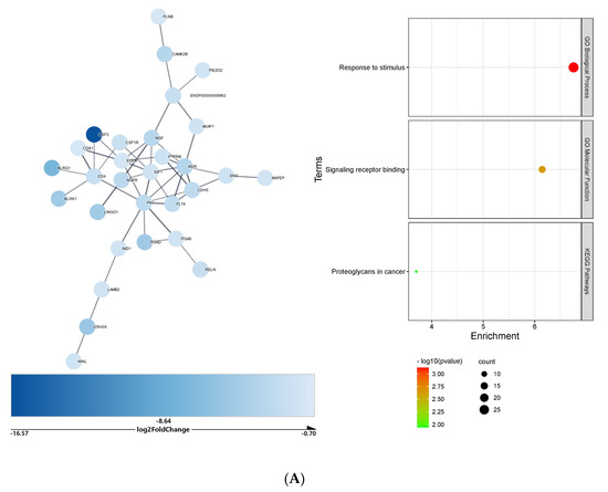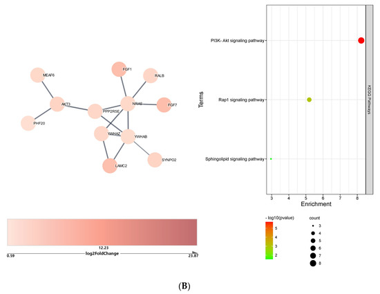 In the liver, the downregulated DEGs targeted by upregulated microRNAs formed a network of 304 nodes with 122 edges. After Markov clustering, the largest cluster comprised 30 nodes and 46 edges (PPI = 2.46 × 10−7), the enrichment analysis of which retrieved GO biological process response to stimulus (28 genes), GO molecular function signaling receptor binding (14 genes), and KEGG pathway proteoglycans in cancer (6 genes) as the most impacted (Figure 6A). The downregulated DEGs targeted by upregulated microRNAs formed a network of 434 nodes and 253 edges. After Markov clustering, enrichment analysis of the largest cluster (12 nodes and 14 edges, PPI = 6.09 × 10−9) identified the PI3K-Akt signaling KEGG pathway (eight genes) as significantly impacted by microRNAs (Figure 6B).