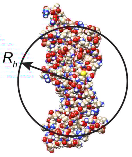 Although the Stokes–Einstein relation was designed for rigid spheres in isotropic medium, it is often used to estimate the size of complicated biological molecules. Unfortunately, frequently, the deviation from the strict spherical shape is substantial, and the use of Stokes–Einstein relation can lead to large inaccuracies and/or misleading conclusions. Additional parameters were introduced to take into account the deviation from the protein spherical shape, i.e., ellipsoid, polymer, rod, or disk [,,,]. However, the related empirical formulas work adequately only in very limited cases. For objects of unknown shape, the size obtained from the Stokes–Einstein equation should be considered as the effective hydrodynamic radius Rh (Figure 1).