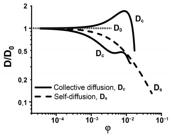 For dilute systems, where inter-molecular interactions and resulting deviations from the average density are absent, the diffusion coefficient is a constant. In the case of dilute solutions, the self- and collective diffusion coefficients are identical Dc = Ds = D0, where the subscript “0” indicates that interactions between diffusing species are absent. In practice, in most of systems, the concentration of diffusing molecules is noticeable, and the inter-molecular interactions affect the translational diffusion []. At the intermediate concentrations, Dc and Ds differ from D0 and strongly depend on the inter-molecular interactions (Figure 2) [,]. It was shown [,,] that the collective diffusion coefficient Dc tends to increase with the growth of the repulsive interactions between molecules and decrease with the prevalence of attractive ones (Figure 2).