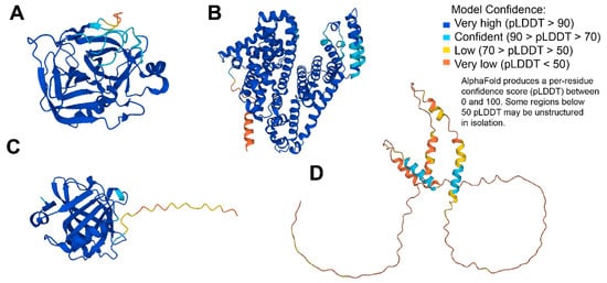 3D structures modeled for the discussed proteins by AlphaFold []: (A) α–chymotrypsin (UniProt ID: P00766); (B) human serum albumin (UniProt ID: P02768); (C) β-lactoglobulin (UniProt ID: P02754); (D) α-casein (UniProt ID: P02662).
