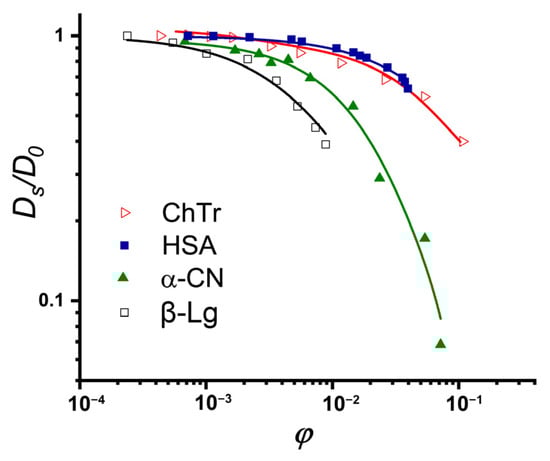 The preliminary analysis of the obtained concentration dependencies for protein self–diffusion coefficient shows that the diffusive mobilities of β-Lg and αS-CN are lower than those of the HSA and ChTr. The sharper, in comparison with the globular HSA and ChTr, concentration-dependent decrease in the α-CN self-diffusion is probably caused by the mostly disordered structure of α-casein molecule [] (see Figure 3C). It is striking that β-Lg has the most precocious decrease of the diffusive mobility against its smallest molecular weight (18 kDa), whereas the presence of protein associates has not been proven. The reason for such early decrease of β-Lg self-diffusion is probably related with the partly disordered structure of β-Lg (see Figure 3B) and the presence of significant attractive PPI of β-Lg at low protein concentration [,,].