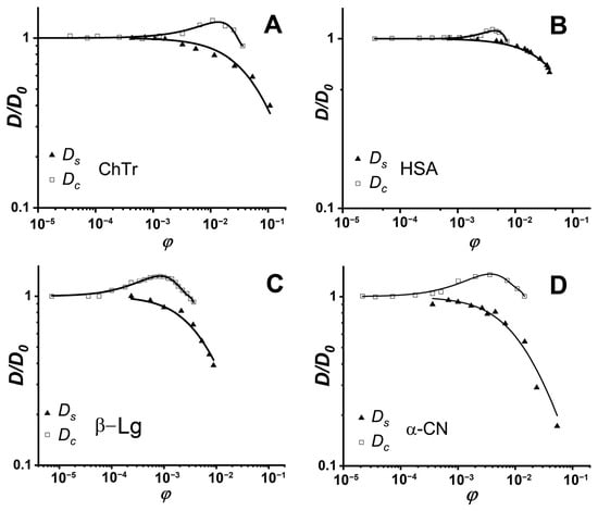 Normalized concentration dependencies of protein self- (triangles) and collective (squares) diffusion coefficients: (A) ChTr (pH = 3.5, I = 0.01 M); (B) HSA (pH = 7.2, I = 0.01 M); (C) β-Lg (pH = 7.0, I = 0.003 M); (D) α-CN (pH = 7.0, I = 0.01 M). Solid lines denote fits of experimental data by the Vink’s algorithm. The original data were obtained from [,,,].