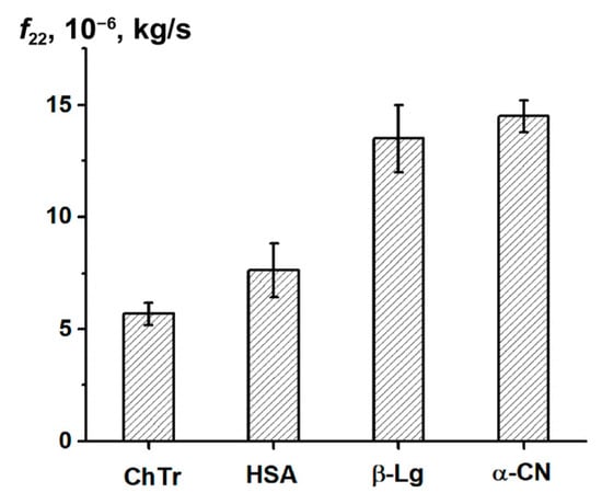 Earlier, Vink theory was successfully applied to the approximation of the experimental data on the self- and collective diffusion of proteins. It was shown that Vink theory well-described the experimental data obtained in the studied concentration range for spheroidal ChTr, HSA, β-Lg, and α-CN [,,,]. The numerical fitting of the experimental self- and collective diffusion data gives the friction and virial coefficients, respectively. According to the Vink’s approach, the hydrodynamic interactions are taken into account by introduction of the solvent–solute (f12) and the solute–solute (f22) friction coefficients. For dilute protein solutions, solvent–solute friction coefficient f12 can be determined by the Stokes–Einstein relation (Equation (2)). Using the thus retrieved f12 values and the fitting parameter ρ, the f22 values were calculated. The f22 value characterizes the influence of the direct and hydrodynamic interactions between the protein molecules on the protein self-diffusion [,]. Figure 6 shows f22 for ChTr, HSA, β-Lg, and α-CN in dilute solution (φ = 0.003). The f22 values for β-Lg and α-CN were found to be higher than those for ChTr and HSA. It can be associated with the influence of disordered fragments in β-Lg and α-CN structure, which can provide the steric PPI prior to the associates formation [,].