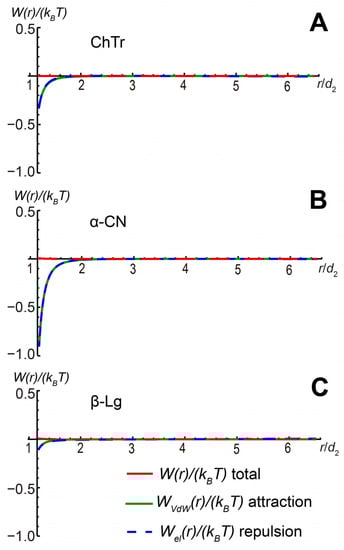 Total paired PPI potential and its contributing parts for (A) ChTr (pH = 3.5, I = 1.0 M); (B) α-CN (pH = 7.0, I = 0.1 M); (C) β-Lg (pH = 7.0, I = 0.1 M).