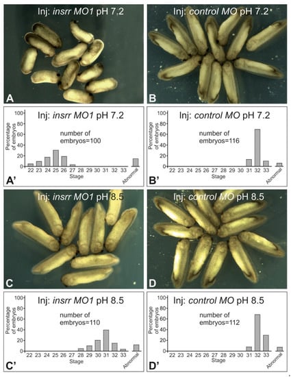Downregulation of insrr by anti-sense morpholino injection retards the Xenopus laevis embryos’ development, whereas alkaline pH prevents this effect. (A). Embryos after injection of insrr MO1 at pH 7.2. (B). Embryos after injection of control MO at pH 7.2. (C). Embryos after injection of insrr MO1 at pH 8.5. (D). Embryos after injection of control MO at pH 8.5. The diagrams on (A’–D’) demonstrate the percentage distribution of embryos, some of which are shown on (A’–D’), by stage of development. As one may see, knockdown of insrr by insrr MO1 significantly retards the developmental rate of embryos comparing to their control siblings, and also distribution of the knocked-out embryos developed at pH 8.5 is significantly shifted towards the distribution seen in the wild-type siblings developed at pH 7.2 and pH 8.5.
