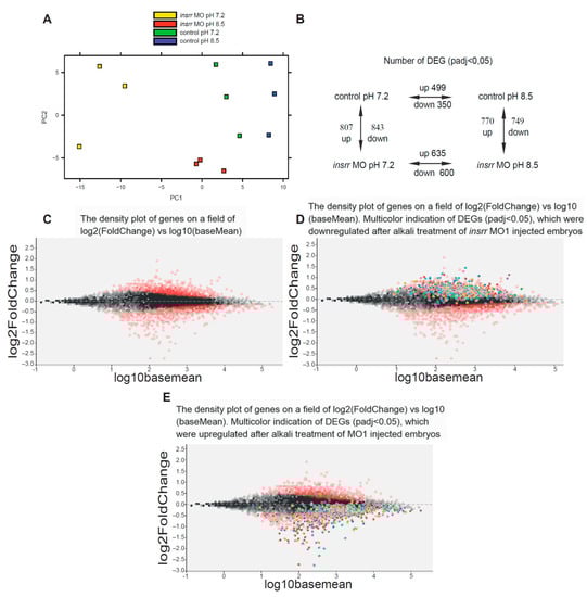 (A). PCA analysis of RNA-seq data of control embryos and insrr MO1 knockdown embryos after incubation in pH 7.2 or 8.5 media. (B). Representation of upregulated and downregulated DEGs (padj < 0.05) of control embryos and insrr MO1 knockdown embryos after incubation in pH 7.2 or 8.5 media. (C). The density plot of genes on a field of log2(FoldChange) vs. log10(baseMean) was plotted after differential expression analysis of transcriptomes between control and insrr MO1 knockdown embryos. DEGs with padj < 0.05 are colored in red and other genes are colored in grey. (D). Same plot with multicolor indication of DEGs (padj < 0.05) which were downregulated after alkali treatment of insrr MO1-injected embryos. (E). Same plot with multicolor indication of DEGs (padj < 0.05), which were upregulated after alkali treatment of insrr MO1-injected embryos.