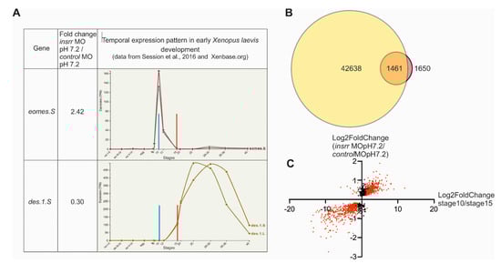 (A). Example of the temporal expression profiles of eomes.S and des.1.S genes. Data from [] and Xenbase.org. (B). The intersection of expressed genes from previously published Xenopus laevis stage gene expression analysis at 10 and 15 stages and DEGs between transcriptomes of the control and insrr MO1-injected embryos at pH 7.2. (C). Graphical plot log2 (Fold change insrr MO 7.2/control MO 7.2) vs. plotted log2 (FoldChange stage10/stage15) for each 1465 DEGs. Red color indicated only DEGs between stage 10 and stage 15.