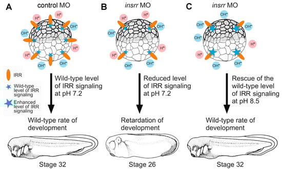 A model of the regulation of embryonic development by IRR. (A). In embryos injected with the control MO and at the neutral pH (7.2), the level of IRR signaling is enough to ensure the wild-type rate of embryonic development. (B). If insrr is downregulated by injection of insrr MO, the concentration of IRR molecules significantly but not completely decreases. As a result, at neutral pH (7.2) a decreased level of IRR signaling leads to the retardation of development. (C). At alkaline pH (8.5), despite the concentration of IRR molecules being significantly decreased in embryos injected with insrr MO, the level of the IRR signaling enhances, which ensures the wild-type rate of embryonic development.