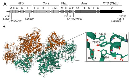 Schematic representation of detected TG variants. (A) Representation of TG variants in the primary structure of the human TG monomer. In the context of the 3D structure, the monomer of TG was divided into five regions: the amino-terminal domain (NTD), and the core, flap, arm, and carboxy-terminal domains (CTD), corresponding to the dimeric choline esterase-like domain (ChEL). Primary sequence-based internal homology domains named type 1, 2, and 3 TG-like repeats, as well as the ChEL domain are labeled as A to V. The hormonogenic tyrosines Y24, Y1310, Y2573, and Y2766 are indicated. (B) Representation of the residue p.Y2563C (colored in pink) in one monomer of the cryo-electron microscopy structure of TG homodimer (PDB ID 6SCJ). Monomers are displayed in orange and green. Close-up view of the structure showing Y2563-interacting residues Y2564, D2714 and F2717.