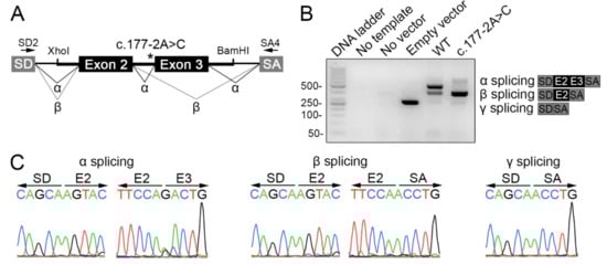 Total RNA was extracted 24 h after transfection with pSPL3-based minigene reporters using the Direct-zol RNA MiniPrep Kit (Zymo Research, Irvine, CA, USA). Complementary DNA synthesis and PCR amplifications were carried out as previously described []. The pSPL3-specific primer set was as follows: SD2 5′-GTGAACTGCACTGTGACAAGCTGC and SA4 5′-CACCTGAGGAGTGAATTGGTCG. RT-PCR products were analyzed by agarose gel electrophoresis. The PCR products were gel purified using Wizard SV Gel and the PCR Clean-Up System (Promega), and sequenced to verify the identity of spliced exons (Macrogen).