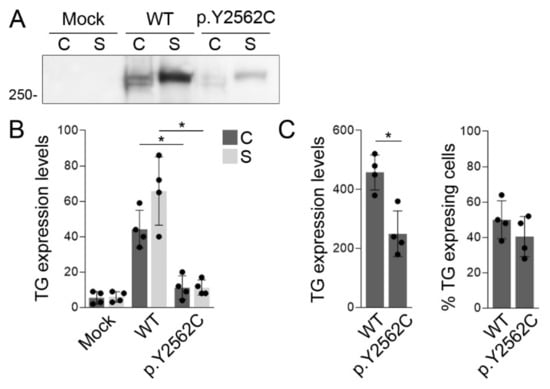 The variant p.Y2563C reduces the secretion of TG polypeptides. (A) Representative western blot analysis of TG expression in serum-free supernatants (S) and cell lysates (C) of HEK-293T cells transiently transfected with an empty expression vector (Mock) or expression vectors encoding full-length mouse TG or p.Y2562C TG. Monomers of TG were resolved as a single band of a molecular mass corresponding to ~330 kDa. (B) Densitometric analysis of TG expression levels in cell lysates (C) and supernatants (S). Data are expressed as relative units calculated based on the background-subtracted mean intensity of WT or p.Y2562C TG bands ± SD (n = 4). * p < 0.05 vs. WT TG-expressing cells (ANOVA, Holm-Sidak tests). (C) Flow cytometry analysis to assess transfection efficiency and TG expression levels in permeabilized HEK-293T cells transiently expressing WT or p.Y2562C TG. The TG expression levels are expressed as median fluorescence intensity (MFI) ± SD (n = 4). * p < 0.05 vs. WT TG-expressing cells (Student’s t-test).