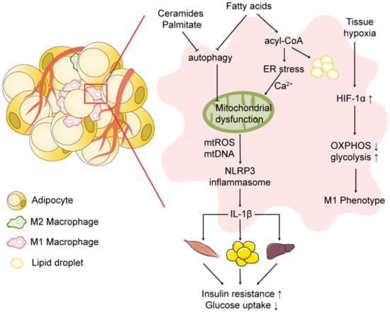 Mitochondrial dysfunction and NLRP3 inflammasome activation in obese adipose tissue. During obesity, the hypertrophy and hyperplasia of adipose tissue induce local tissue hypoxia and the infiltration of macrophages in adipose tissue. Under hypoxia, activated HIF-1α shifts cellular energy metabolism from OXPHOS to glycolysis and induces the macrophage M1 phenotype. Excessive uptake of free fatty acids by adipose tissue macrophages shifts fatty acid utilization from OXPHOS to triglyceride, phospholipid, and ceramide synthesis, promoting lipotoxicity in macrophages. Fatty acids induce disruption of ER structure and ER stress, leading to mitochondrial calcium overload and mitochondrial dysfunction. Impaired autophagy induced by ceramides, palmitates and saturated fatty acids leads to the accumulation of dysfunctional mitochondria. Mitochondrial dysfunction induces activation of the NLRP3 inflammasome and release of IL-1β, promoting the progression of insulin resistance. Symbols: ↑ = increase; ↓ = decrease. Abbreviations: OXPHOS, oxidative phosphorylation; ER, endoplasmic reticulum; HIF-1α, hypoxia-inducible factor-1α.