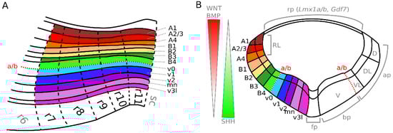 More recently it has been shown that the developing hindbrain can be dorsoventrally divided into at least 16 hypothetical longitudinal domains based on the presence of progenitor cell populations and discrete patterns of gene expression [,]. They arise in the developing neural tube as a consequence of dorsoventral patterning by gradients of signaling molecules secreted by the rp (WNT, BMP) and fp (SHH) that, dependent on the concentration and duration of the exposure, control the expression of transcriptional activators and repressors in responding cells (Figure 1B) []. Eight alar (dorsal) domains (dA1–dA4 & dB1–dB4) have been described with strong evidence, whereas the eight basal (ventral) domains (v0d, v0d, v0c, v1, v2a, v2b, MN, and v3l) have merely been described based on estimations and are largely homologous to the domains present in the spinal cord (Figure 1B) [,].