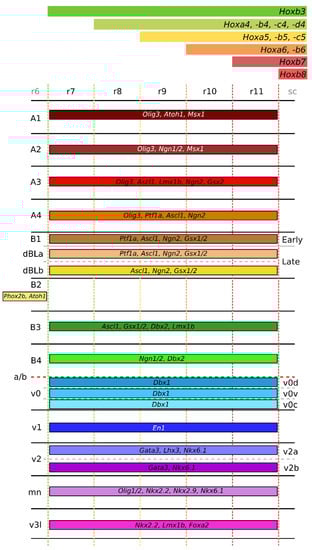 Within the medulla, 15 of these progenitor domains are present, as it is lacking the dB2 progenitors [,]. Each of them has a unique genetic developmental organization that lay the foundation of the generation of diverse neuronal components essential for adult medullary organization and function []. These progenitor domains ultimately give rise to multiple genetically distinct neuronal subpopulations with distinct migratory paths, neurotransmitter phenotypes, and axonal projection patterns, thereby contributing to the establishment of neuronal diversity and functional nuclei in the adult medulla [,].
