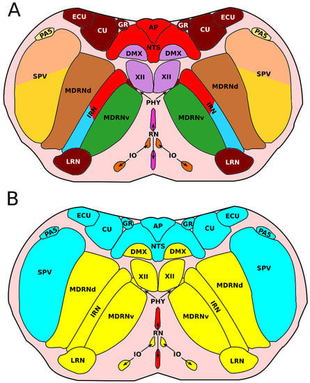 - Jones, S.E.; Stanić, D.; Dutschmann, M. Dorsal and Ventral Aspects of the Most Caudal Medullary Reticular Formation Have Differential Roles in Modulation and Formation of the Respiratory Motor Pattern in Rat. Brain Struct. Funct. 2016, 221, 4353–4368. [Google Scholar] [CrossRef]
