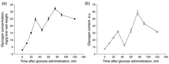 Although our work was devoted only to the first half of the absorption phase, the total duration of which is ~4 h [34,35], the concentration of glycogen in the liver after glucose administration in fasted rats increased by more than an order in 2 h (Figure 1a). It should also be noted that the rate of glycogenesis during the studied time interval was not constant: periods of rapid glycogen synthesis (0–30; 45–75 min) alternated with periods when glycogen degradation prevailed over its synthesis (30–45 min; 75–120 min) (Figure 1a,b).
