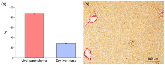 A percentage of the parenchyma and dry mass of rat liver (a). Rat liver section stained with picrosirius for morphometric analysis of liver parenchyma (b).
