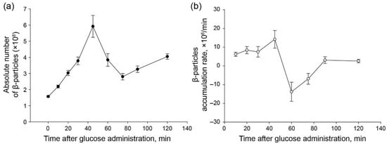 The content of glycogen in cells can change both by changing the number of β-particles and by increasing or decreasing the number of glucose residues in them. Determination of the number of β-particles in hepatocytes showed that the cells of fasted rats contain ~1.6 × 108 glycogen particles. During refeeding of rats with glucose, the number of β-particles gradually increases and reaches a maximum (~5.9 × 108) in 45 min after per os administration of glucose to fasted animals, but then rapidly decreases and then changes insignificantly (Figure 3a). The data obtained indicate that the amount of β-particles of glycogen in hepatocytes is not constant. In cells, apparently, there is a continuous synthesis and degradation of glycogen particles, and at different stages of life, one or another process predominates. An analysis of the dynamics of the number of β-particles after glucose administration in starved animals (Figure 3) suggests that during refeeding, not only the synthesis of additional glycogen molecules occurs, but the replacement of “old” molecules by “new” ones. We believe that the number of old glycogen particles (~1.6 × 108) does not change until about 45 min, but then they degrade and disappear completely by about 75 min after the start of refeeding.