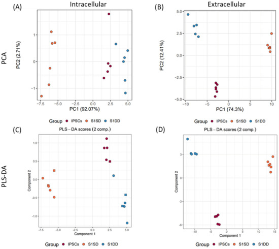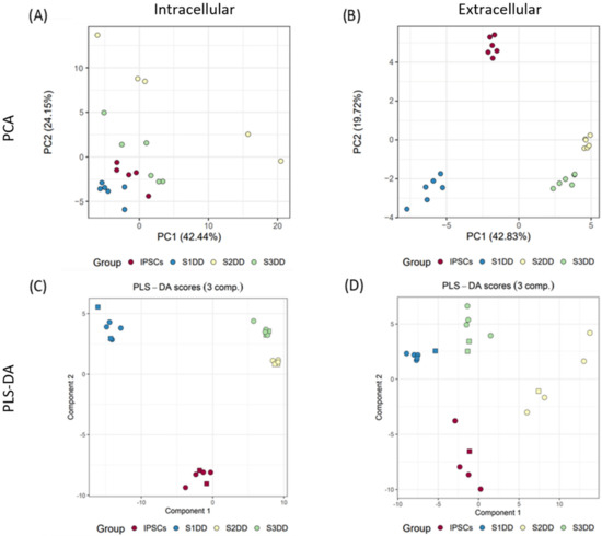 Comparison of the intracellular metabolite profiles of the DD Stages 1–3 and IPSCs by PCA demonstrated distinct profiles (Figure 3). PCA demonstrated that Stage 2 (day 11) DD samples had higher intragroup variance than the other DD groups, potentially representing an increased heterogeneity of cells at this stage of the protocol. The same distinction between groups was visible when comparing extracellular metabolite profiles albeit with lower intragroup variance.