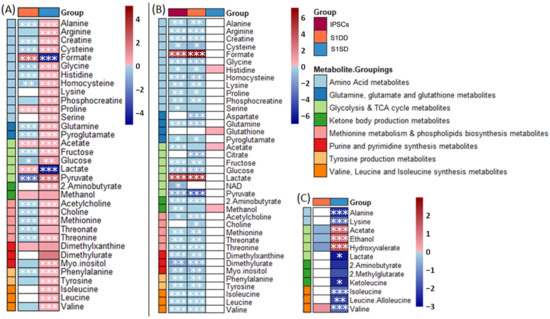 Fold change analysis of key metabolites between pluripotent IPSC and Stage 1 differentiation. (A) Intracellular metabolite changes (with baseline corrected to cell-free controls) for DD (blue) or SD (orange) versus IPSC; (B) Extracellular metabolite changes directly compared to the respective cell-free controls for IPSC (red) DD (blue) or SD (orange); (C) Intracellular methyl-containing metabolites for DD (blue) or SD (orange) versus IPSC samples. For clarity, metabolites are grouped according to key cellular processes. Red cells indicate a fold-change increase, blue cells indicate a fold-change decrease. Cells left white were found to be neither significantly different (<0.05 FDR-adjusted p-value) nor with VIP > 1 (by multivariate discriminant analysis). Asterisks indicate FDR-adjusted p-values < 0.05 (*), < 0.005 (**), or < 0.001 (***).