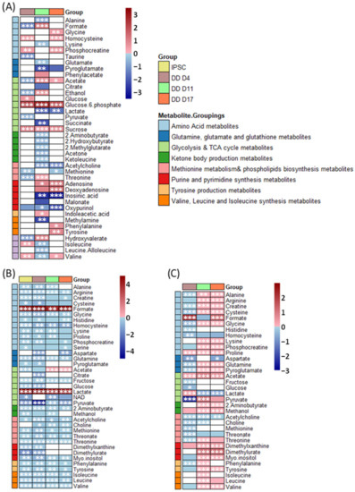 Fold change analysis of key metabolites for pluripotent IPSC and directed differentiation stage 1 (DD D4), 2 (DD D11) and 3 (DD D17). Fold change analysis of (A) intracellular metabolites with respect to pluripotent (IPSC) metabolite levels; (B) extracellular metabolites with respect to cell-free control; (C) extracellular metabolites with respect to IPSC levels. Red cells indicate a fold-change increase, blue cells indicate a fold-change decrease. Cells left white were found to be neither significantly different (<0.05 FDR-adjusted p-value) nor with VIP > 1 (by multivariate discriminant analysis). Asterisks indicate FDR adjusted p-values < 0.05 (*), < 0.005 (**) or < 0.001 (***).