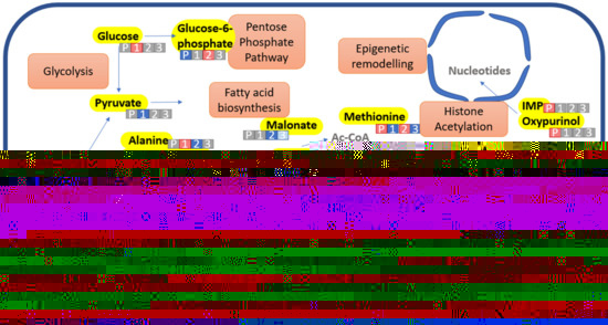 Our analysis also determined a significant decrease in intracellular acetate between pluripotent IPSC and Stage 1 DD and these results were consistent with previous work that reported the reduction of intracellular acetate with early exit of pluripotency, underpinning its role as a critical regulator of the balance between self-renewal and differentiation [18]. Decreased intracellular acetate and histone acetylation has been shown to be concomitant with the down regulation in OCT3/4 RNA and protein expression that can be blocked in a dose-dependent manner by the exogenous supplementation of acetate [18]. The metabolic regulation of epigenetic state through post-translational chromatin modification and the cadence of transcription factor access to DNA binding sites is critical for moderating the self-renewal and differentiation of pluripotent cells [18,55,56]. Further scrutiny of the 1H NMR metabolomic dataset identified metabolites that might be associated with DNA histone methylation and S-adenosylmethionine (SAM) cycling, including methionine, threonine and formate, but these were not significantly changed between pluripotent IPSC and Stage 1 of DD to allow us to predict with any confidence a role for histone methylation in the regulation of DD in our protocol.