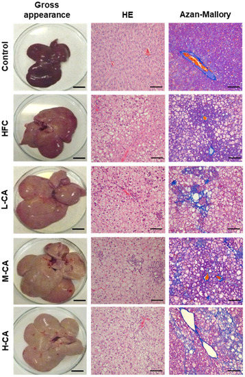 Representative liver morphology and histopathology in the control, HFC and L-CA, M-CA and H-CA groups. Gross appearance of liver surface; scale bars = 4 cm. Hematoxylin and eosin (HE)- and Azan-Mallory stained section; scale bars = 100 μm. HFC, high-fat and high-cholesterol; L-CA, M-CA and H-CA, the HFC diet with 0.1%, 0.5% and 2.0% sodium cholate (w/w), respectively.
