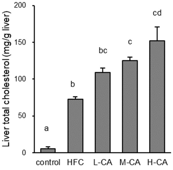 Cholesterol content of the liver in the control, HFC, and L-CA, M-CA and H-CA groups. Values are expressed as means ± SE. n = 5–6/group. a,b,c,d values not sharing the same lowercase letter are significantly different among groups (p < 0.05). HFC, high-fat and high-cholesterol; L-CA, M-CA and H-CA, the HFC diet with 0.1%, 0.5% and 2.0% sodium cholate (w/w), respectively.