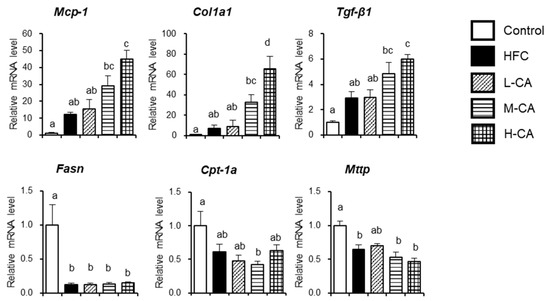 Hepatic gene expression involved in inflammatory response, fibrogenesis, and lipid metabolism in the control, HFC and L-CA, M-CA and H-CA groups. The levels of mRNA were expressed relative to the control group. Values are expressed as means ± SE; n = 5–6/group. a,b,c,d values not sharing the same lowercase letter are significantly different among groups (p < 0.05). HFC, high-fat and high-cholesterol; L-CA, M-CA and H-CA, the HFC diet with 0.1%, 0.5% and 2.0% sodium cholate (w/w), respectively; Col1a1, procollagen type I, alpha 1; Cpt-1a, carnitine palmitoyltransferase-1a; Fasn, fatty acid synthase; Mcp-1, monocyte chemotactic protein-1; Tgf-β1, profibrotic marker transforming growth factor-β1.
